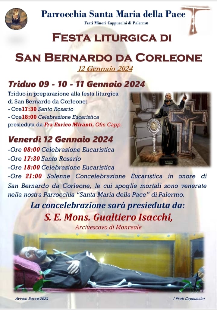 Inizia oggi, nella nostra chiesa di Palermo, il triduo di preparazione alla festa liturgica di san Bernardo da Corleone predicato da fr. Enrico Miranti e che culminerà con la solenne concelebrazione Eucaristica presieduta da mons. Gualtiero Isacchi, Arcivescovo di Monreale.