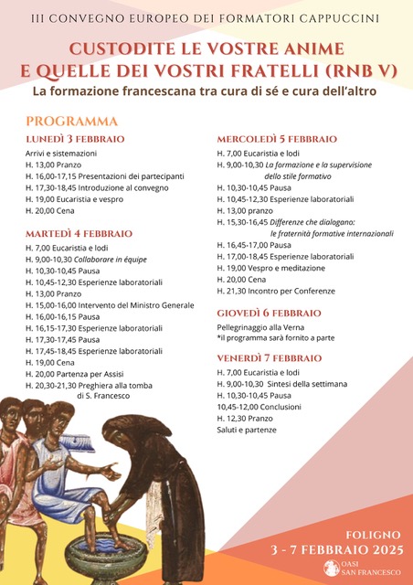 Dal 3 al 5 febbraio si è svolto a Foglino il Convegno Europeo dei formatori cappuccini. Il tema di questo III convengo è stato: "Custodite le vostre anime e quelle dei vostri fratelli" (RnB V). La formazione francescana tra cura di sé e cura dell'altro.