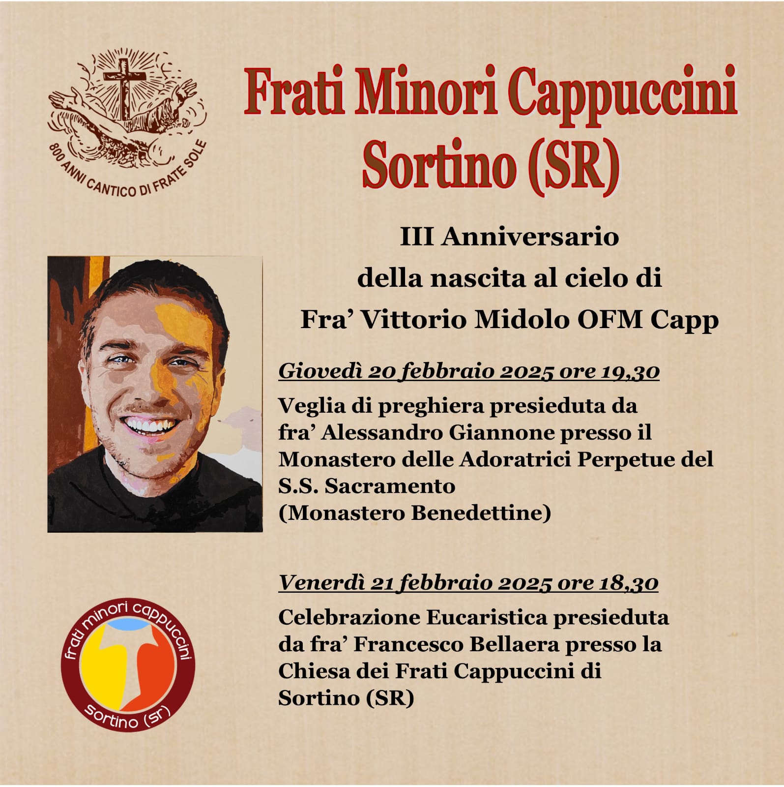 In occasione del III anniversario della nascita al cielo del nostro confratello fr. Vittorio Midolo, giovedì 20 febbraio alle ore 19:30, presso il Monastero delle Adoratrici Perpetue del S.S. Sacramento di Sortino, si terrà una veglia di preghiera presieduta da fr. Alessandro Giannone e venerdì 21 febbraio, presso la Chiesa del nostro convento di Sortino, sarà celebrata l'Eucaristia presieduta da fr. Francesco Bellaera. Ci uniamo nella preghiera per il nostro caro fr. Vittorio che affidiamo alla misericordia del Padre.