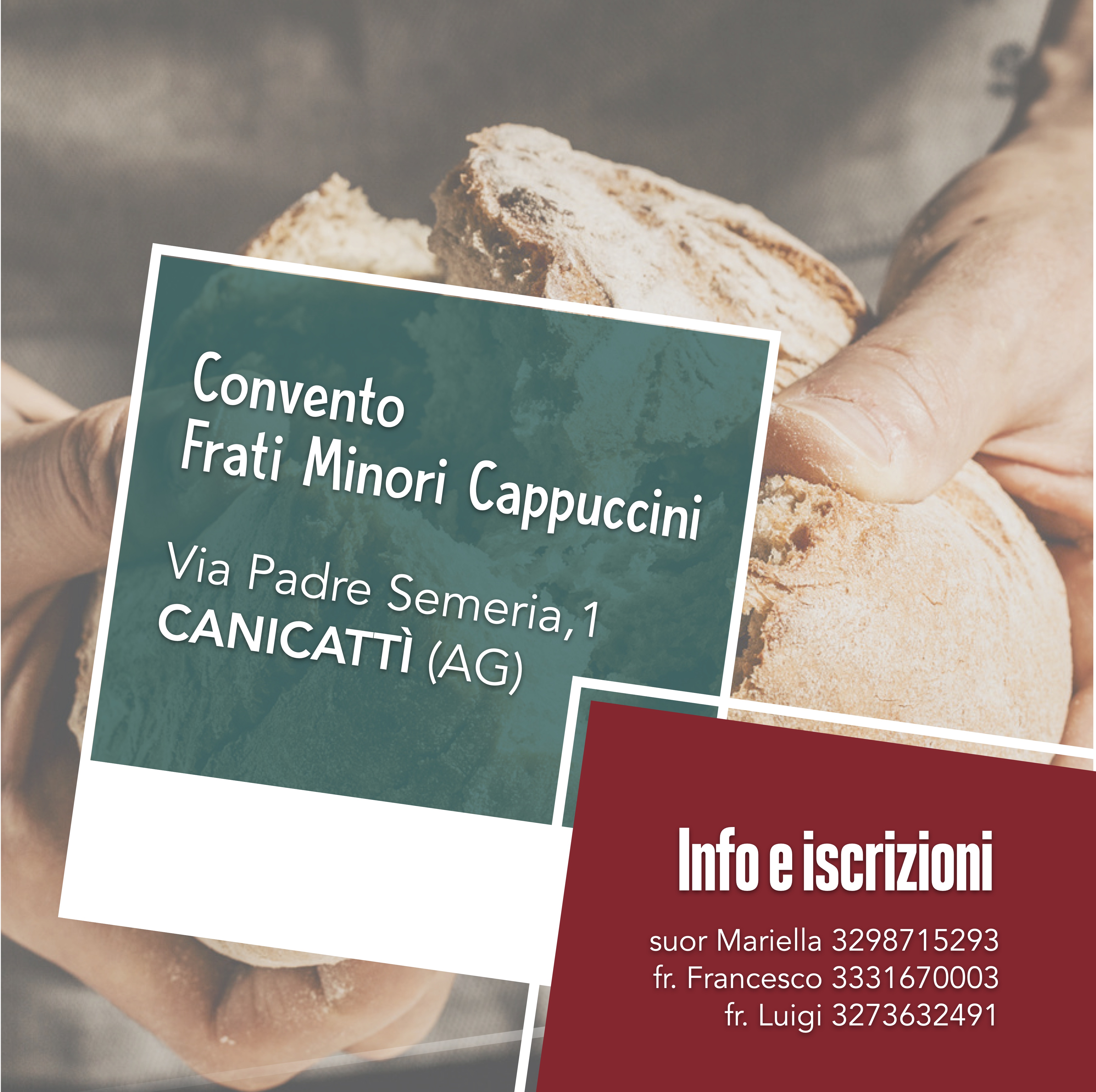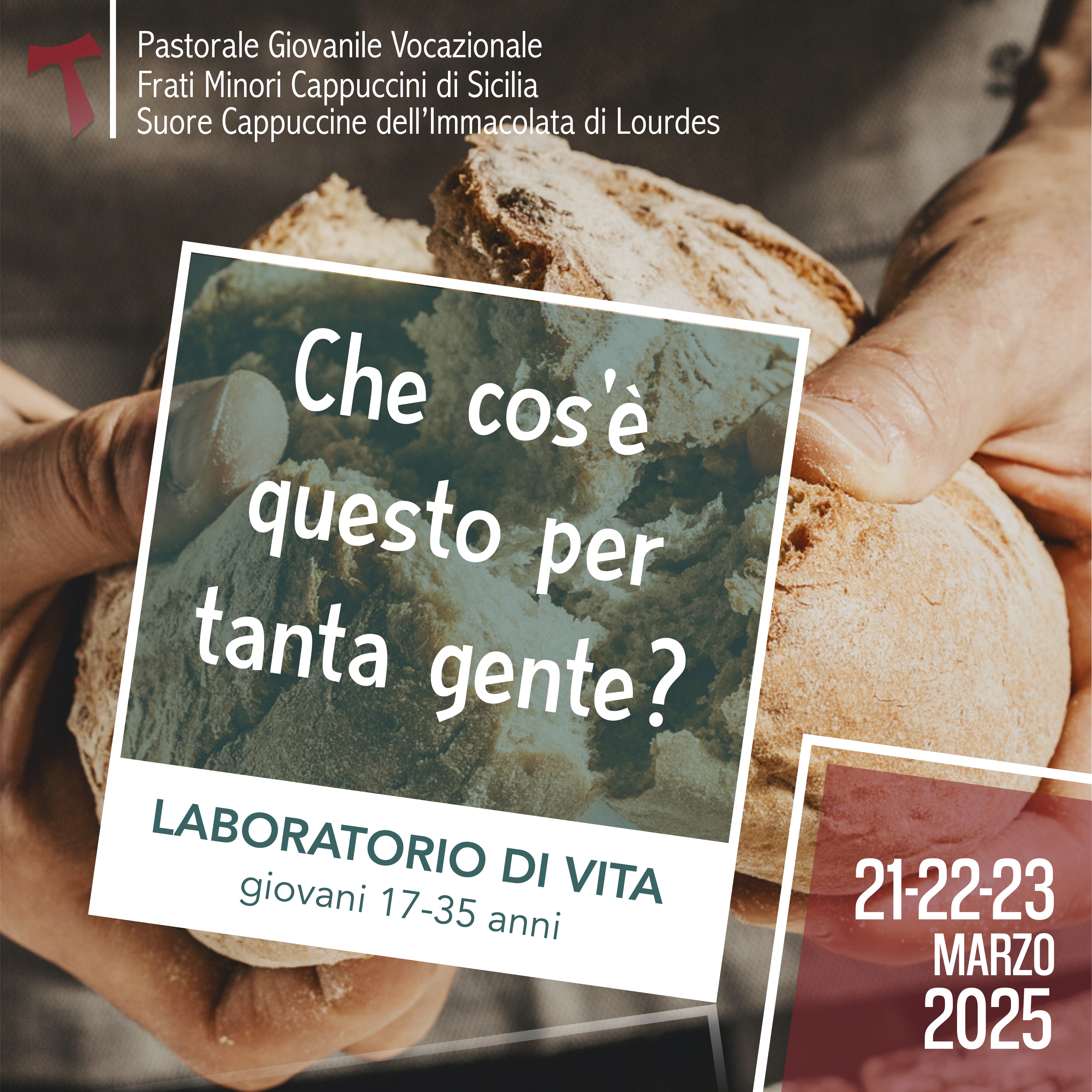 Il laboratorio di vita è una proposta rivolta ai giovani dove si ha la possibilità di immergersi in un testo evangelico e lasciarsi interrogare da esso, di fare un'esperienza di preghiera e di fraternità. Nei giorni 21-22-23 marzo 2025 presso il nostro Convento di Canicattì si terrà il secondo appuntamento che ha come titolo "Che cos'è questo per tanta gente?" (Gv 6). Per informazioni e iscrizioni rivolgersi ai numeri indicati nella locandina.