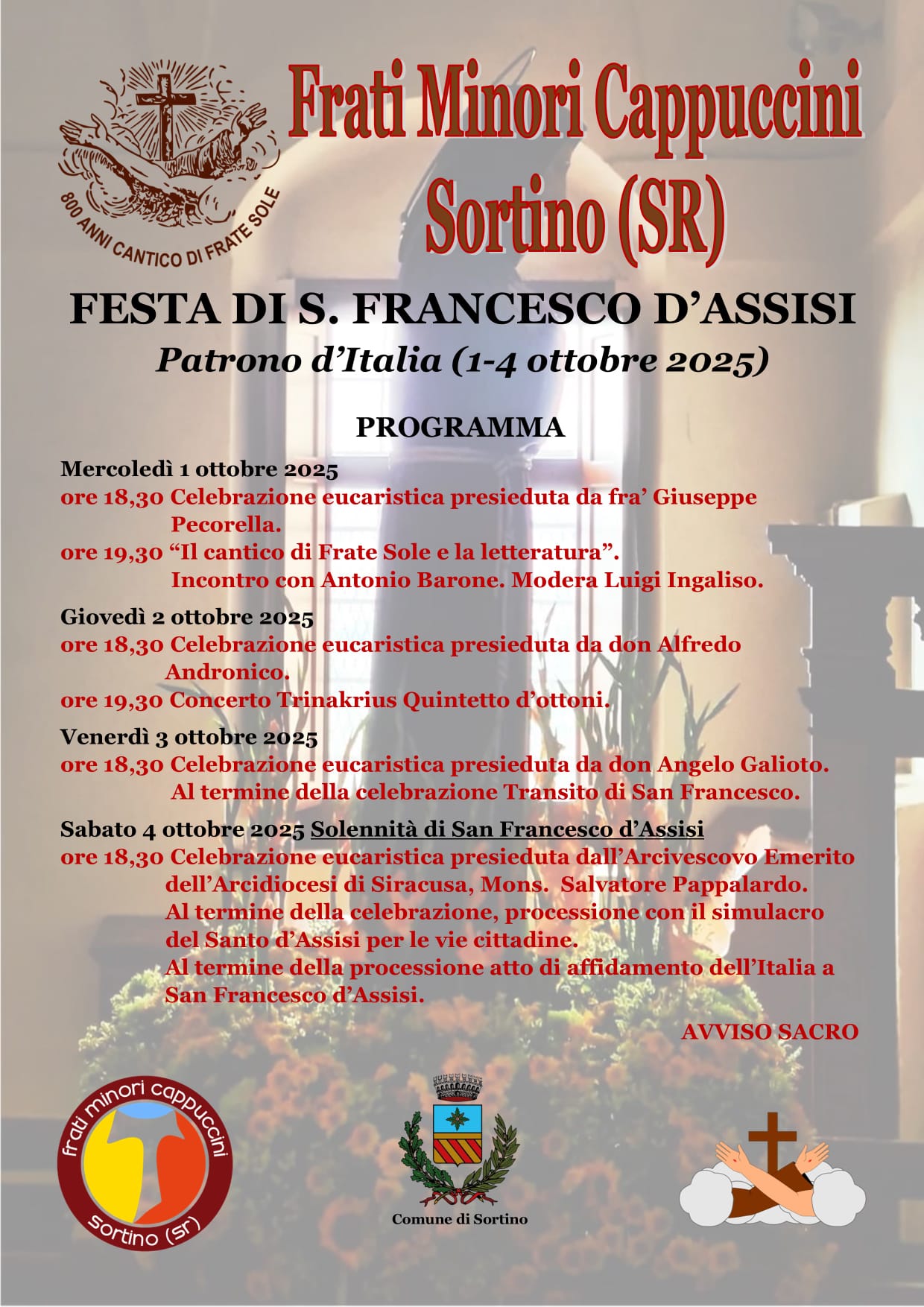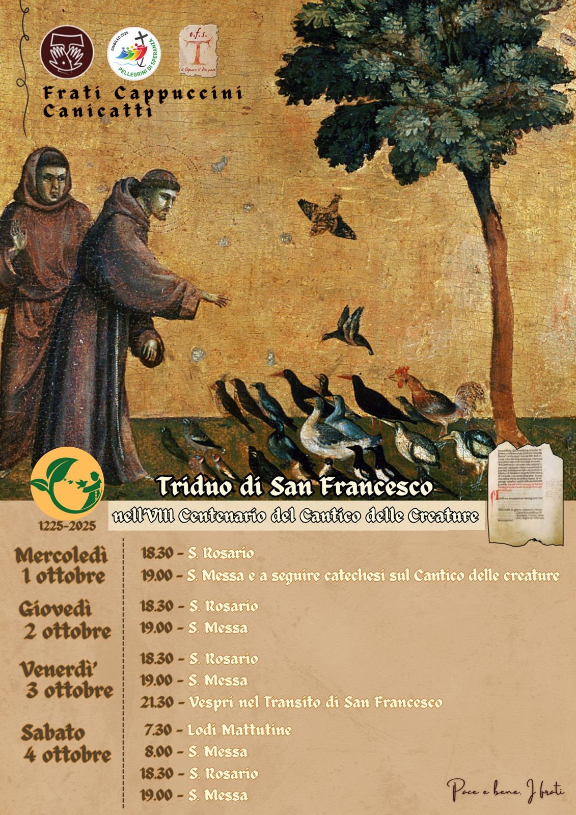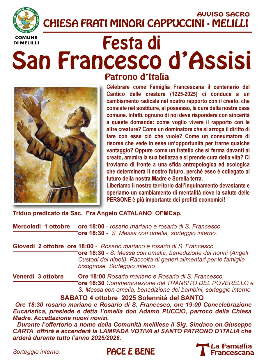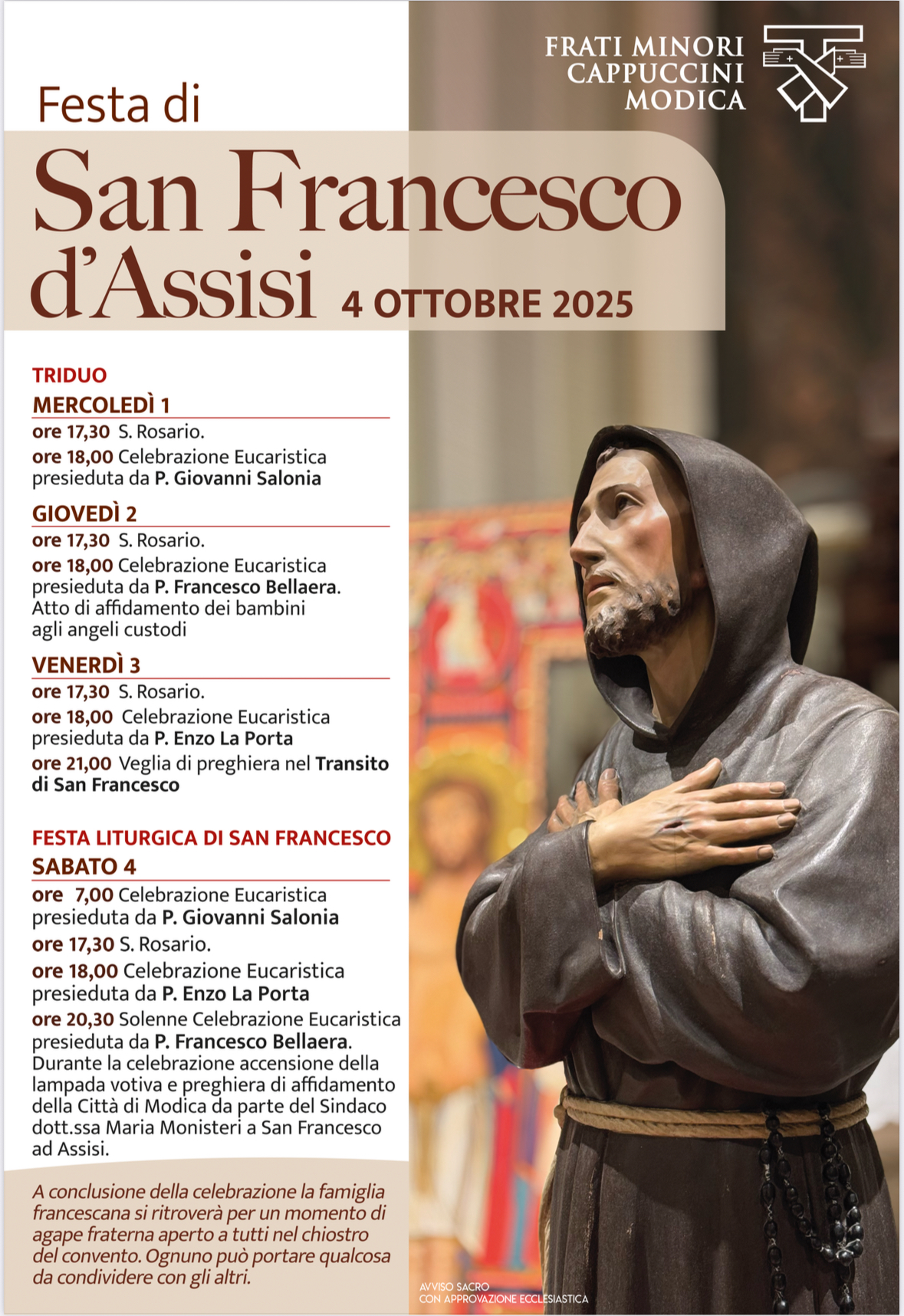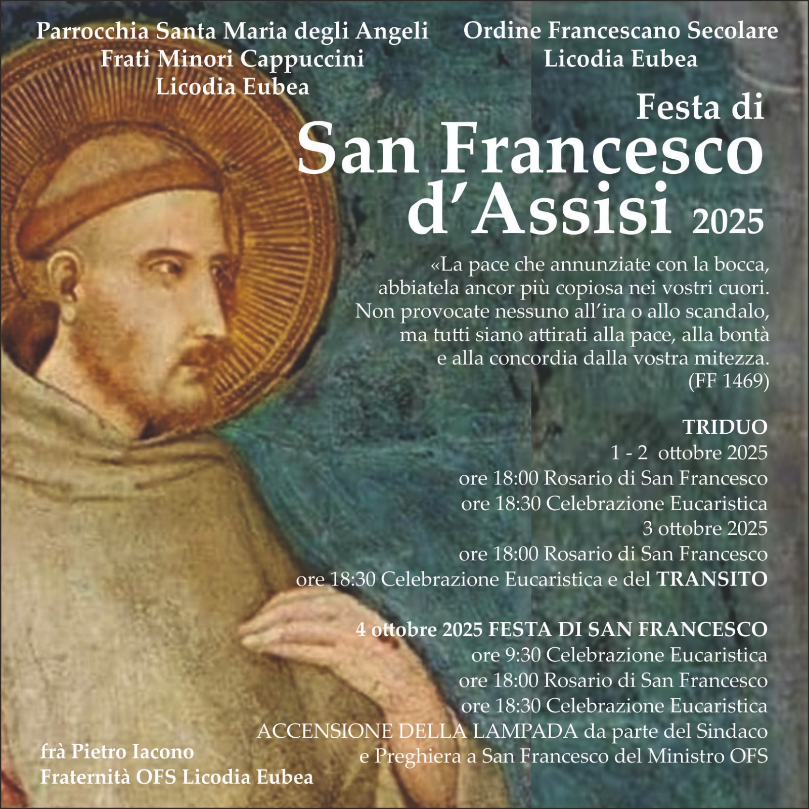 Di seguito i programmi del Triduo e della Festa di San Francesco che verranno celebrarati nei nostri conventi. Trova il luogo a te più vicino, noi frati saremo lieti di accolgierti e condividere con te questi giorni di preghiera, di ascolto e di festa!
