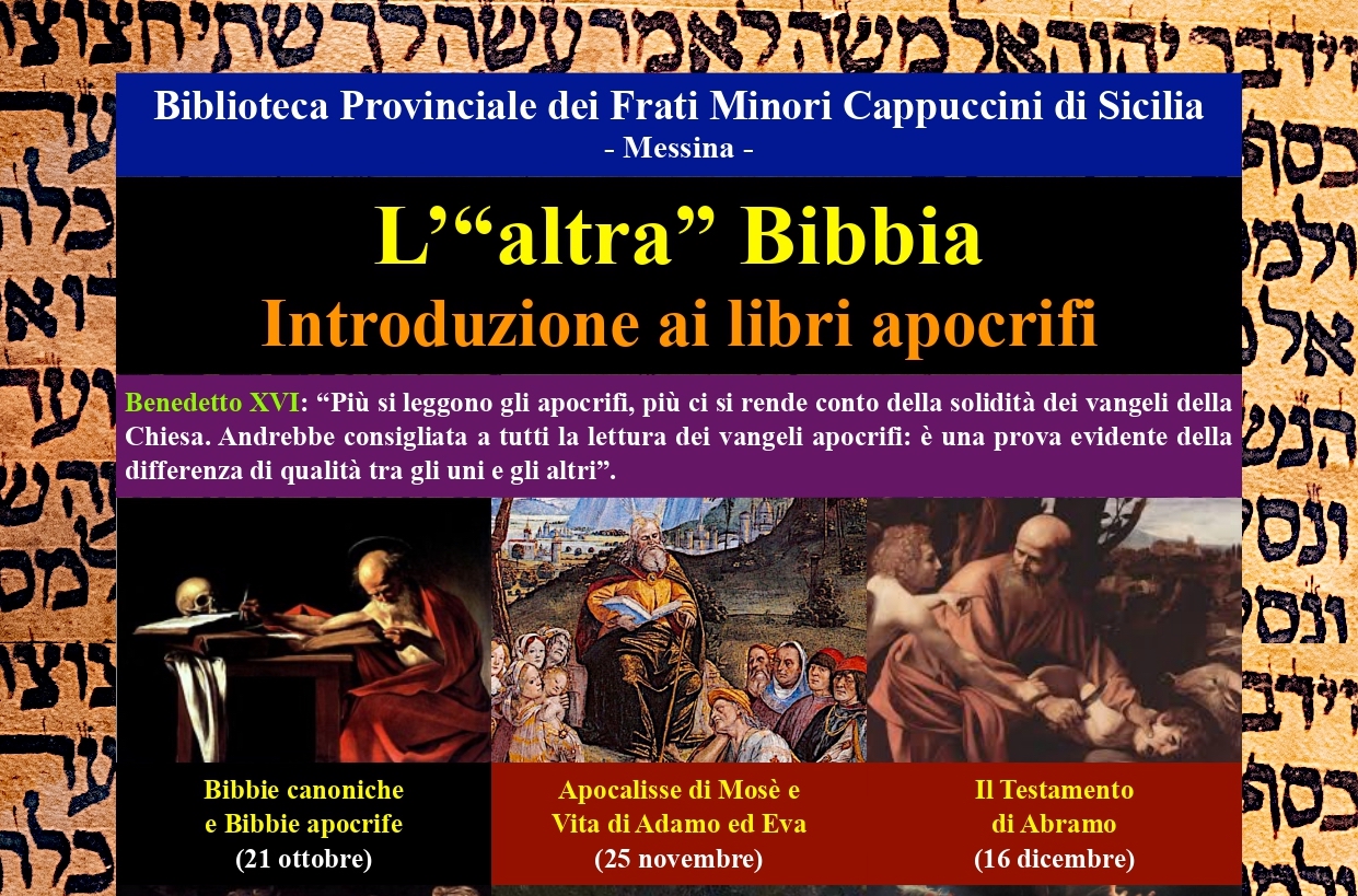 Martedì 16 dicembre 2025 alle ore 17:30 presso l'Auditorium della Biblioteca Provinciale dei Frati Minori Cappuccini di Messina si terrà il terzo incontro del ciclo di letture "L'"altra" Bibbia. Introduzione ai libri apocrifi" tenuto da fr. Filippo Cucinotta. Il tema sarà: Il Testamento di Abramo. Di seguito il link per seguire l'incontro in diretta o in differita.